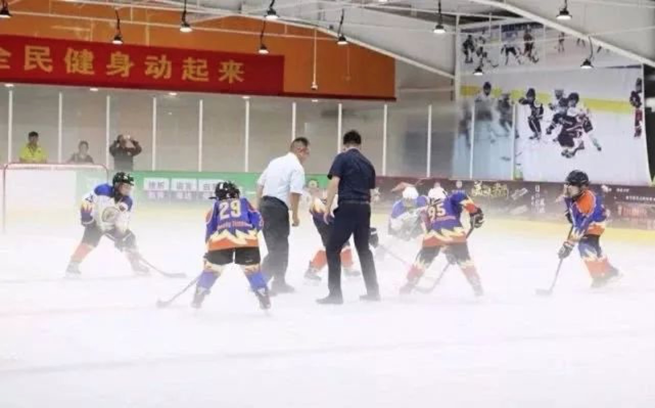 活動現(xiàn)場一隊活力四射的小學生展開了一場精彩的冰球?qū)官?